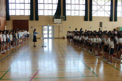 まず、今月の歌「ドンマイ」。2年生によるかわいらしいオリジナルアレンジもありました。みんなで手拍子を入れたりしながら楽しく歌えました。
