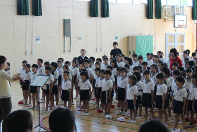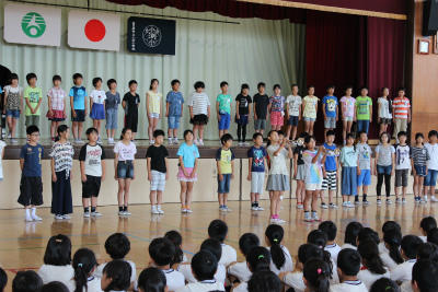 はじめに、今月の歌「エーデルワイス」を全校合唱、そのあと、5年生が「君をのせて」の合唱を披露してくれました。 他の学年の子どもたちは、5年生の歌声に聴き入っていました。