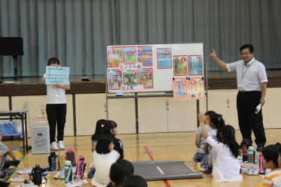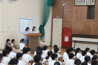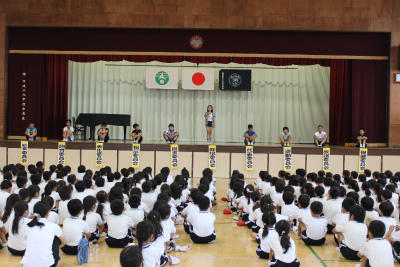 今日の児童朝会は、児童会活動各委員会の活動内容の紹介や、活動を進めるにあたってのみなさんへのお願いについて、各委員長から発表しました。