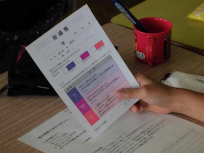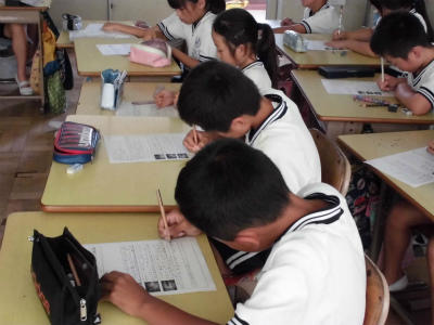 意見交換、話し合いを振り返り自分の考えをプリントに記入しています。