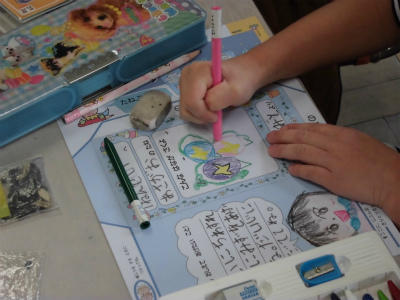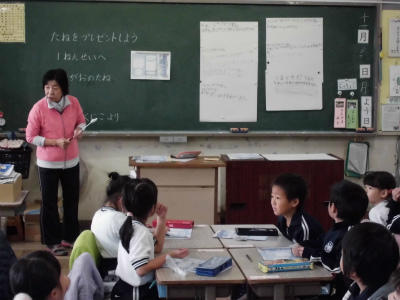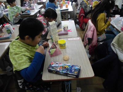 1年生の生活科の授業です。今日は、育てていたあさがおから取り出した種を来年の1年生にプレゼントするため、種を入れる封筒にメッセージを書いたり、絵を描いたりしました。