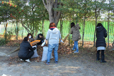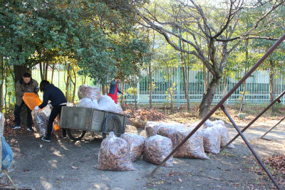 今日は2回目となるPTAの皆様による「落ち葉掃き」が行われました。お忙しい中、10名の方々にお手伝いいただいて、校地内外の落ち葉を片付けていただきました。