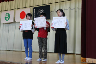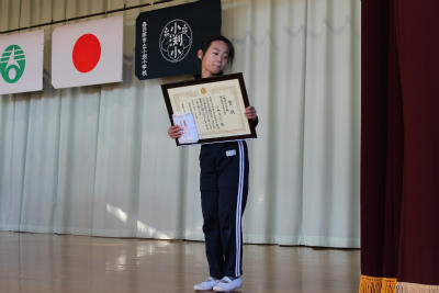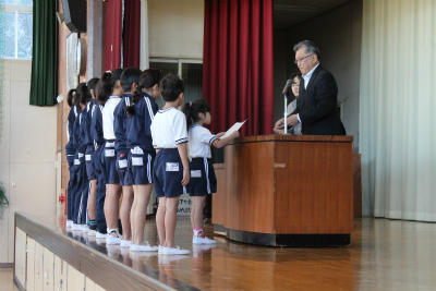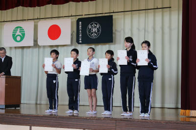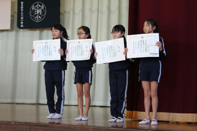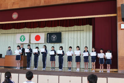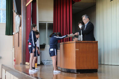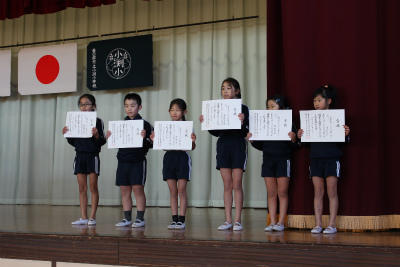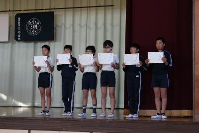 今日の体育朝会では、先に行われた校内持久走大会(各学年男女別6位までの個人)、そして、リレー大会(男女別3位までのチーム)、run run run(ラン・ラン・ラン/3位までのクラス)の表彰を行いました。表彰された個人・団体のみなさん、おめでとうございます。