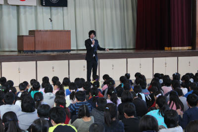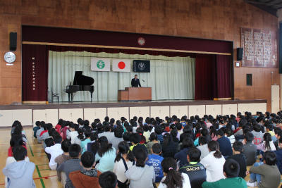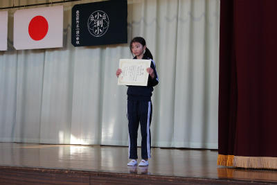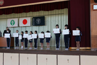 今日の表彰朝会は、市内美術展、郷土を描く美術展など、図工関連の活躍に対する表彰でした。先日の運動関係に引き続き、多くの賞状を渡すことができました。