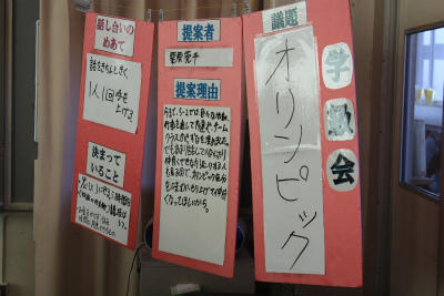 5年2組の学級活動の様子です。今日の議題は「5年2組オリンピックをしよう」。何だか楽しそうですね。司会グループのリードで、どんな種目をやるのか。どんな工夫をするのかなどについて意見を出し合い、みんなで検討を重ねて決めていきました。
