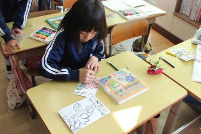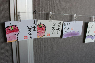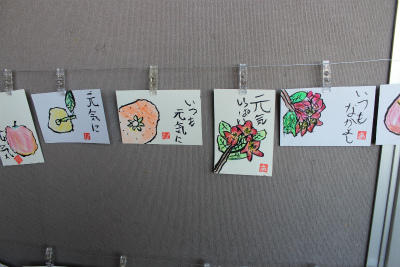 思い思いの花や果物などを描き、そこに自分の好きなひと言を添えます。色使いや絵と文字の配置を工夫しながら、それぞれ味のある作品に仕上がりました。