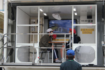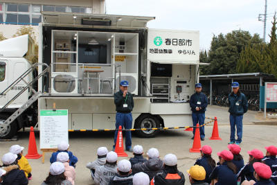 2校時、6年生は、市役所の方々に御指導いただきながら、春日部市の起震車「ゆらりん」を使用し、地震の揺れを体験しました。