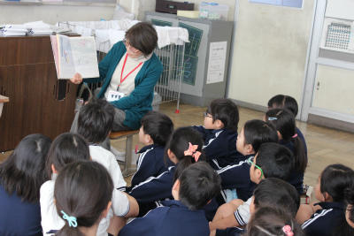 今日の朝、1年生と2年生のお話会(読み聞かせ)がありました。3年生は残念ながら学級閉鎖中で実施できませんでした。