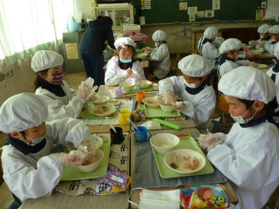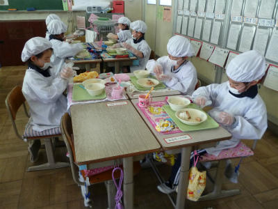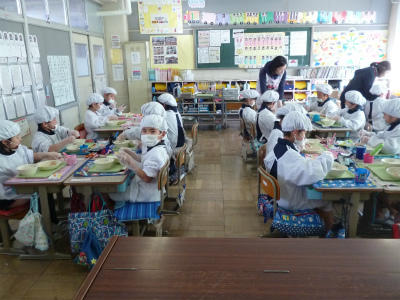 24日(水)、1年生が、おにぎり作りに挑戦しました。 お弁当などでおなじみの「おにぎり」、いつもお家の方がつくってくれるけど、自分で作れるかどうかやってみました。