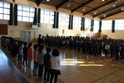 今日の業前は、体育館に集まっての「小渕っ子の四季」練習でした。