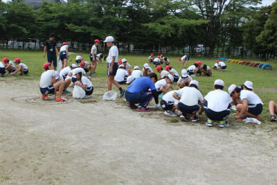 陸上大会も終わり、体育もプールでの授業になってくると、校庭には緑色が目立つようになってきます。今日の業前活動は、全員で校庭の草取りをしました。