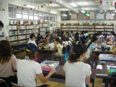 5年生は林間学校で今日も頑張っているところですが、小渕小では図書室開放1日目、朝から多くの子どもたちが来校しました。