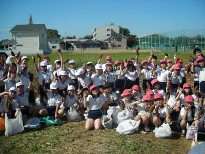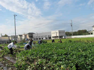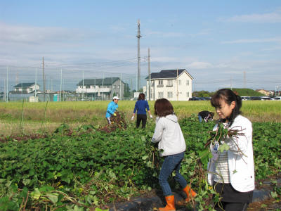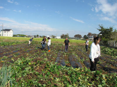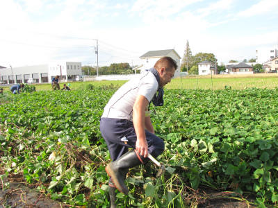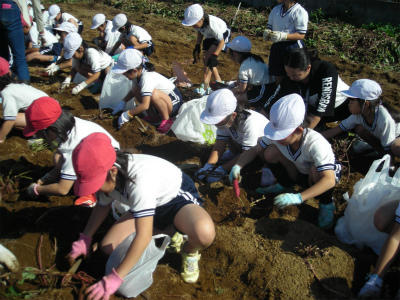 サツマイモの収穫を控え、朝から菅さんと小野寺さんの指導の下、PTA役員の皆さんにも御協力いただいて、サツマイモのつる切りをしました。