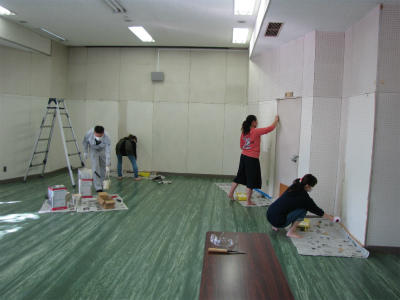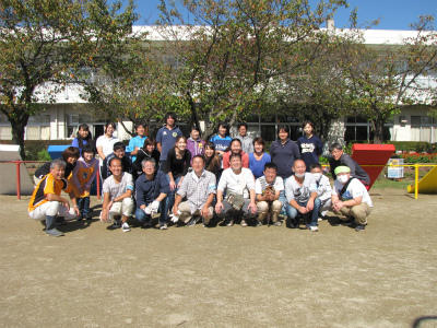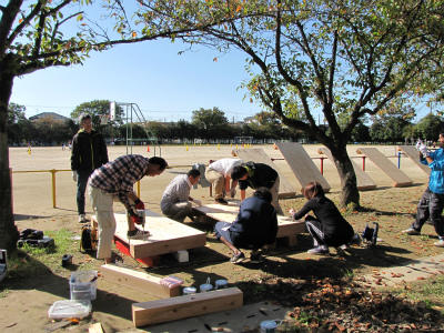 おやじの会の皆さんに「ジャンピングボードづくり」「トトロの森の囲いの塗装」「視聴覚室の壁面塗装」など、環境整備作業をしていただきました。PTA役員の皆さんや子どもたちにも加わってもらいました。