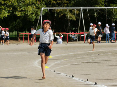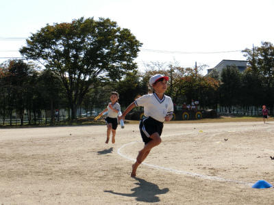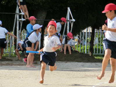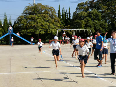 昼休みに校内リレー大会を実施しています。この大会は、4人のチームを作って誰でも参加できる大会です。学年別にタイムハンディがあるので、学年が違っても同じレースで競い合います。