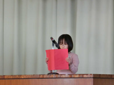 児童代表の発表 頑張ること①チャレンジテスト ②縄跳び ③あいさつ