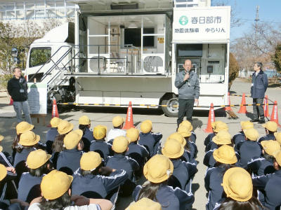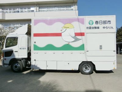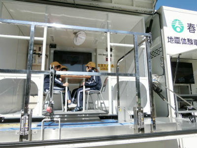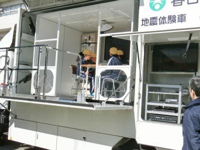 春日部市役所方々に御指導いただきながら、起震車「ゆらりん」での