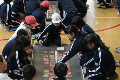 3人1チームになって、競技します。今年も1年生から6年生まで60チームが参加し、トーナメント戦で「小渕小かるたチャンピョン」を決めます。