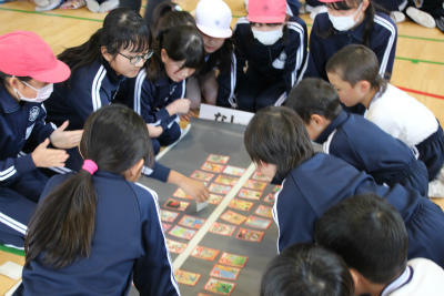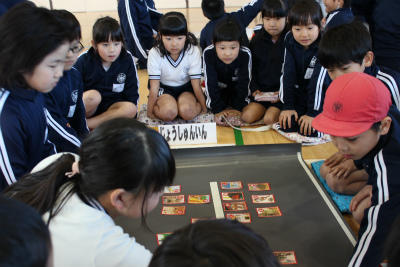 3人1チームになって、競技します。今年も1年生から6年生まで60チームが参加し、トーナメント戦で「小渕小かるたチャンピョン」を決めます。