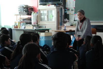 学校生活の紹介。新入児の皆さんも、きちんとした姿勢で聴いてくれています。