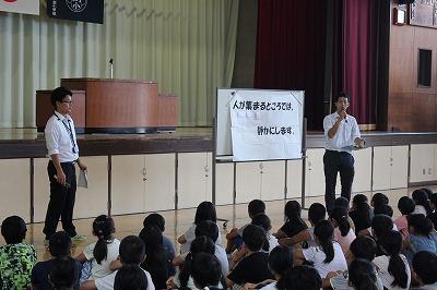9月の生活目標について、二人の先生から問いかけの形式でお話がありました。今月の目標は「人の集まるところでは静かにします。」です。様々な場面で、良い習慣が育つとよいなあと思っています。