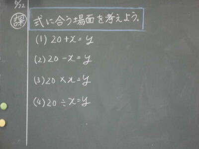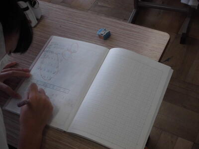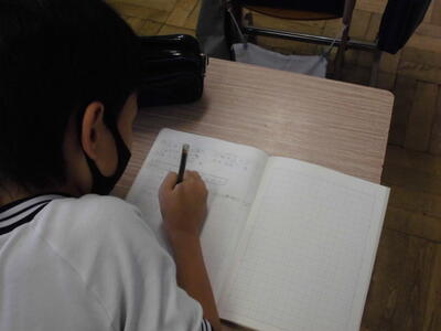 ( ↓ 6年生の算数の授業です。方程式の学習に取り組んでいます。各自が考えて、ノートに真剣にまとめています。)