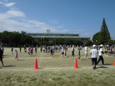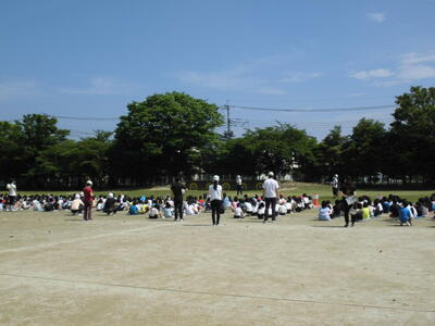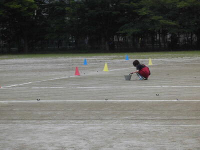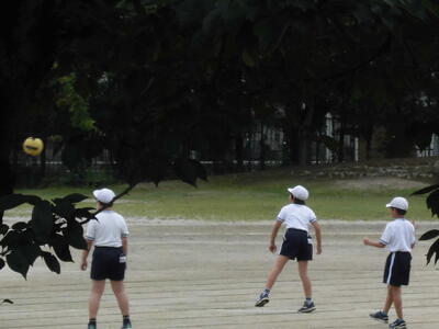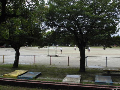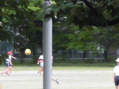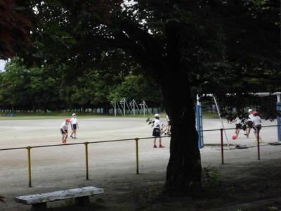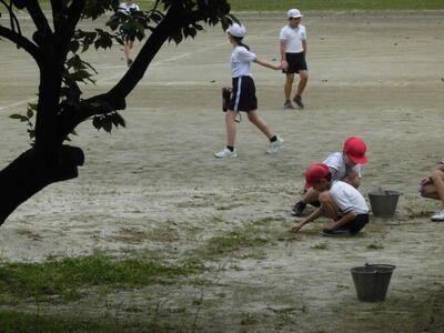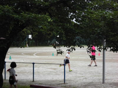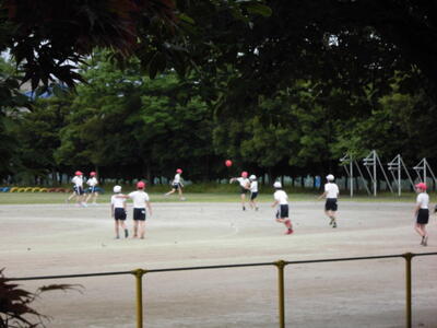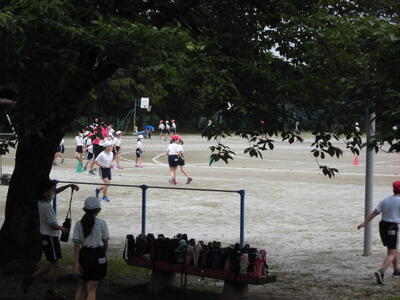 午前中に強く降っていた雨も昼にはあがりました。水はけがよい校庭では、子供たちが元気に遊んだり運動したりしています。