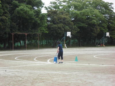 ( ↓ 早朝から先生たちで校庭の整備をおこないました。ラインを引いてコーンを並べてコースを作ったり、石拾いや除草をしたりしました。)