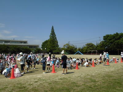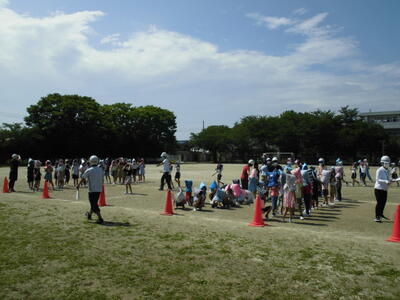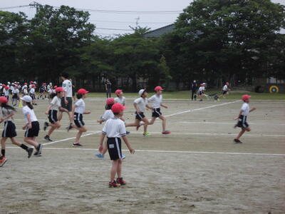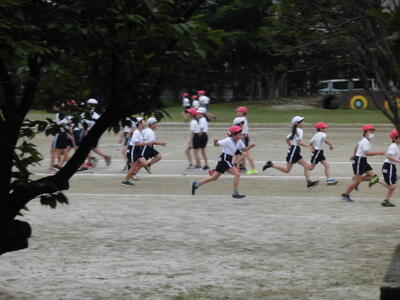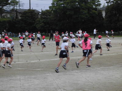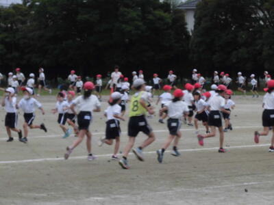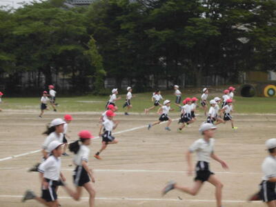 ( ↓ 多くの児童が校庭に出ました。マラソンや8秒間走に取り組んでいます。)