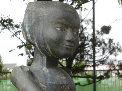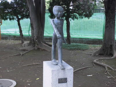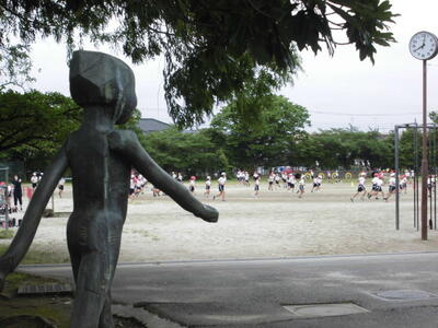 ( ↓ 本校のシンボルとなっている「はだしの像」。子供たちの校庭の運動を見守っています。)