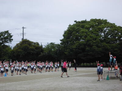 ( ↓ 本日の朝の業前活動は「さわやかタイム」。一運動に続いて、校庭では子供たちが体操したり、トラックを走ったりして運動しました。)