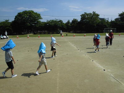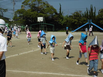 ( ↓ 防災ずきんを着用して、整然と校庭への避難をおこなっています。)