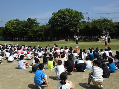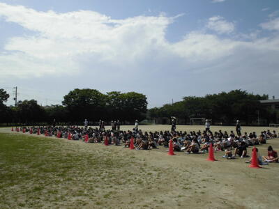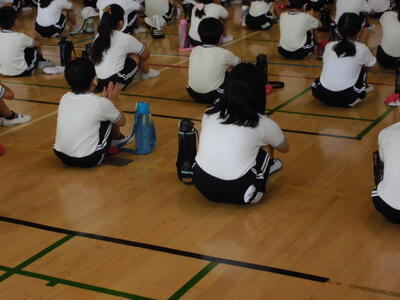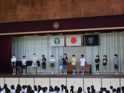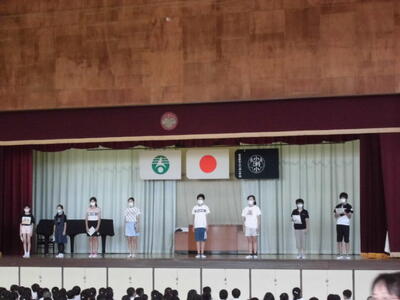 本日は児童朝会がありました。密を避けて、児童同士の間隔を空けながらおこないました。