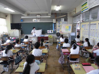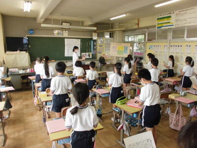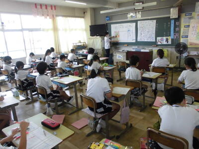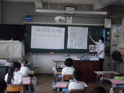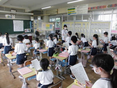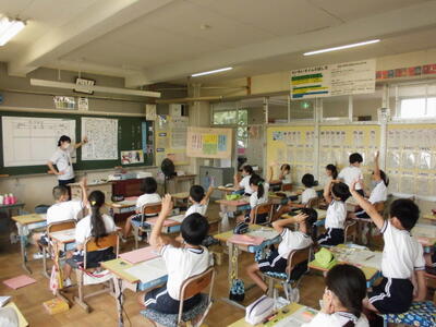 本校では、国語科を中心に、教師の授業改善や児童の学力向上の研究を進めています。本日は、4年生の国語の授業を他の先生たちも参観し、授業の進め方などの研修をおこないます。授業の内容はビデオ撮影し、さらに先生たちで研究を深めていきます。
