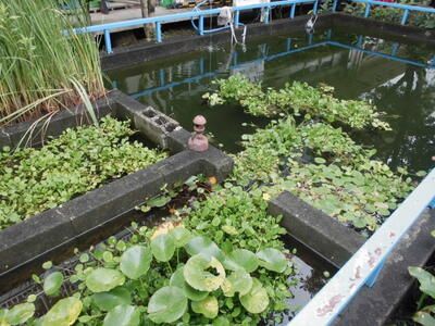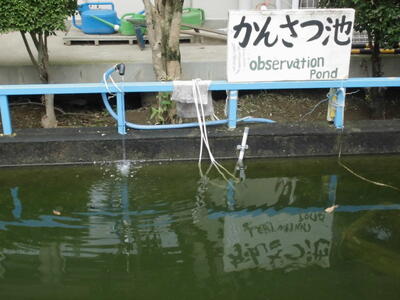 学校の「かんさつ池」でも、水草が浮き、魚が優雅に泳いでいます。2学期には、子供たちが池の様子の観察の学習をおこないます。