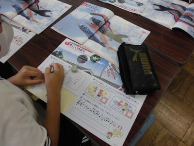 音楽室では、一学期の授業では、飛沫が飛ぶのを防ぐため、声を出して歌を歌うのを控えたり、楽器は演奏せずに指使いのみ練習したりと、配慮して授業をおこなっています。