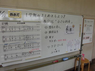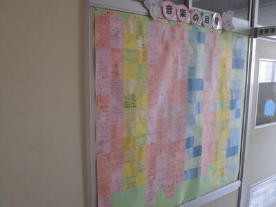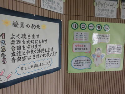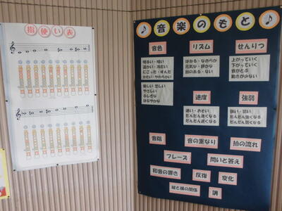 本校の音楽室には、子供たちの音楽への意識を高めるための掲示などが工夫されています。