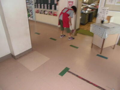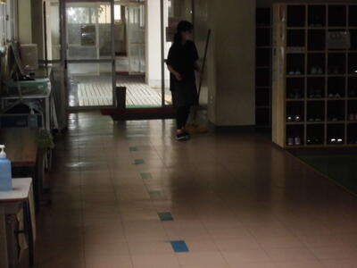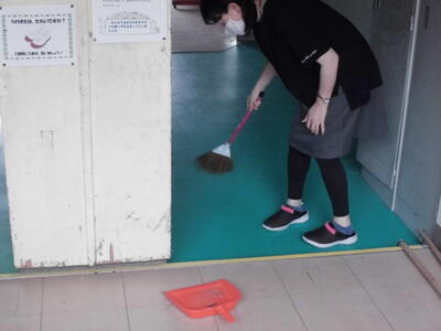 ↓ 職員室前や昇降口を、教務主任・保健室・事務・栄養士の先生たちで清掃しています。