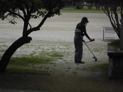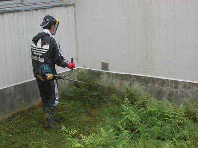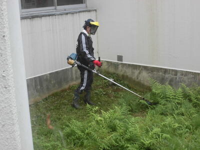 ↓ 外では、校務員さんや校長先生が、雑草を草刈り機できれいに刈り取っています。