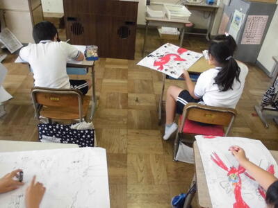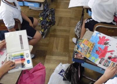 ( ↓ 2年生の教室では図工の時間。先日のザリガニ釣りを思い出しながら、『ザリガニと遊んだよ』のテーマで思い思いの絵を描いています。)