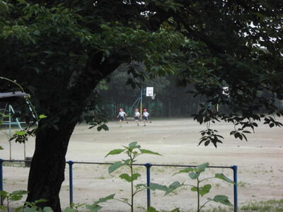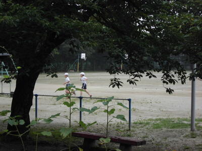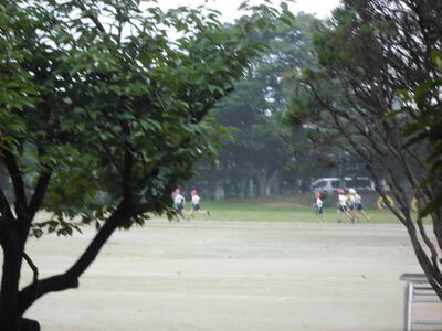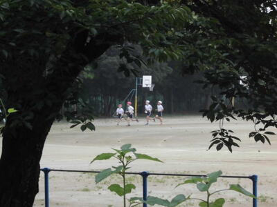 朝の「一運動(いちうんどう)」。子供たちは、登校後、体育着に着替えて積極的に校庭に出て運動します。今日も、多くの子供たちが校庭を走り始めました。残念ながら、くもってきた空から、雨が落ちてきたので、本日の一運動は中止となって、子供たちも校舎へ引き上げました。