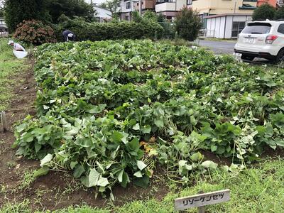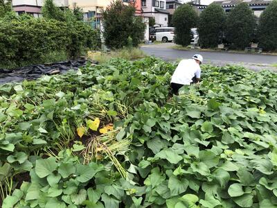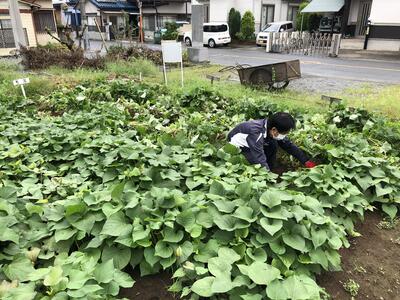 6月に1~3年生が植えたサツマイモ畑。植えた時は細かったイモの苗が、しっかり根付いて、順調に育ってきています。栽培ボランティアの方が畑の世話をしてくれたり、学校の先生たちが除草に行ったりと、サツマイモの成長を見守っています。