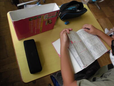( ↑ 4年生の国語。辞書を使って様々な言葉を調べています。)