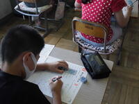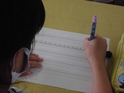 ( ↑ 3年生の国語。アルファベットの書き方を練習しています。)