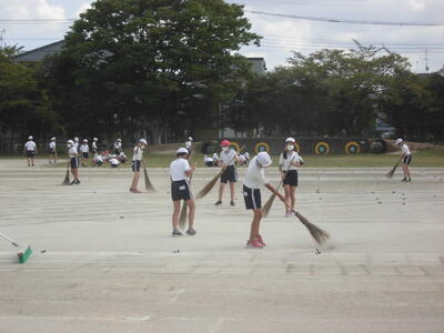 校庭では、運動会にむけて校庭の整備が始まりました。子供たちが校庭を掃いたり、雑草を抜いたりしています。