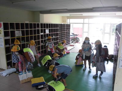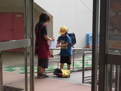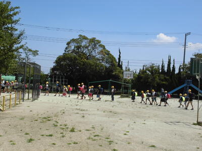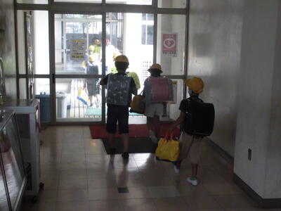 ( ↓ 本日の午後は、一斉下校です。日ざしも暑い中なので、通学班で集まり次第、すぐに下校しました。)