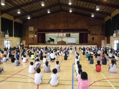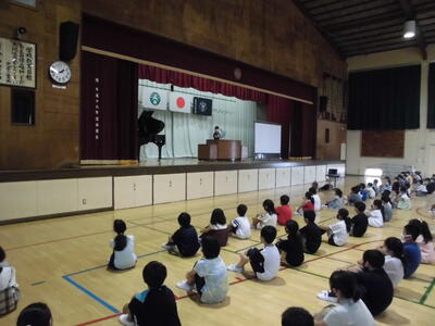 ( ↓ 二学期の始業式です。ウイルス感染拡大防止に気をつけ、児童同士の間隔をあけて集まりました。暑い中での式でもあるので、内容を省略して短時間で行いました。)