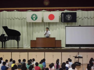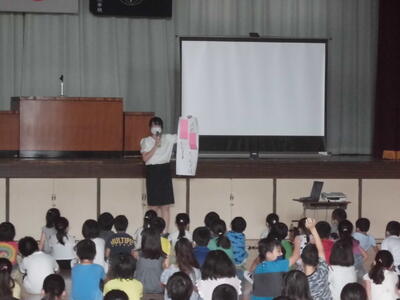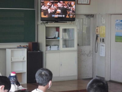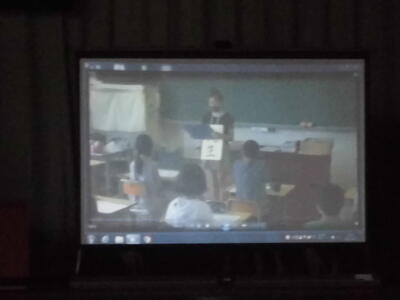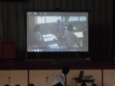 ( ↓ 4年生より、今月の生活目標について映像を見ながらお話がありました。)