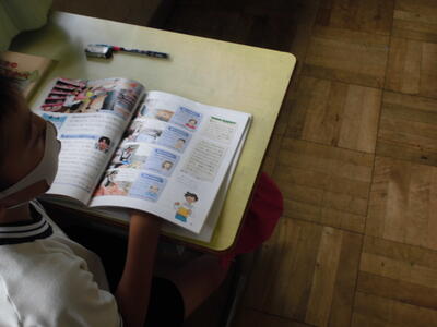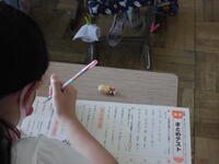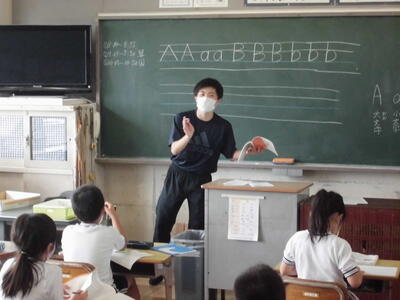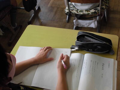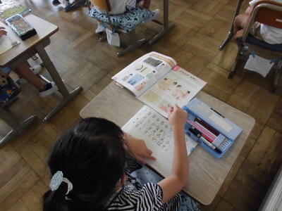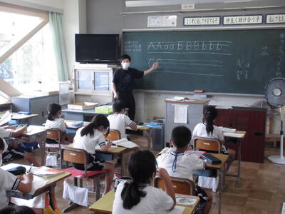( ↑ 3年生の国語。アルファベットの書き方を練習しています。)