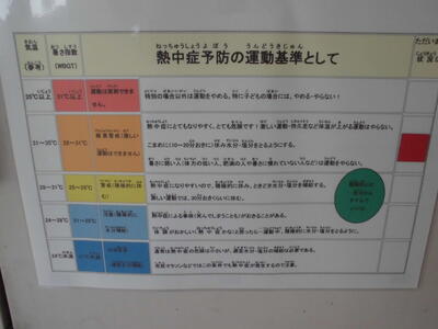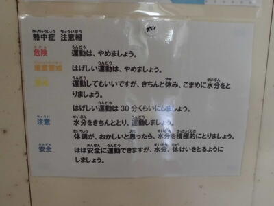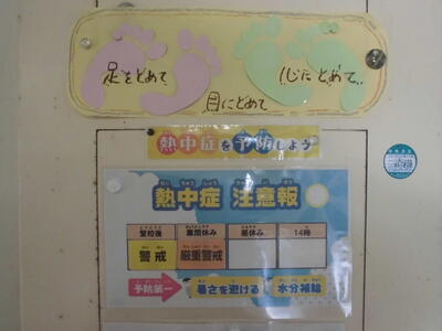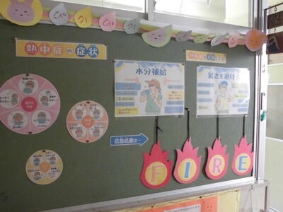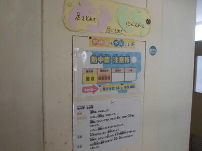 校舎内には、保健室前と児童棟の1階に、保健委員会による熱中症予防を呼びかける掲示があります。保健委員さんが毎日、掲示をおこなってくれています。